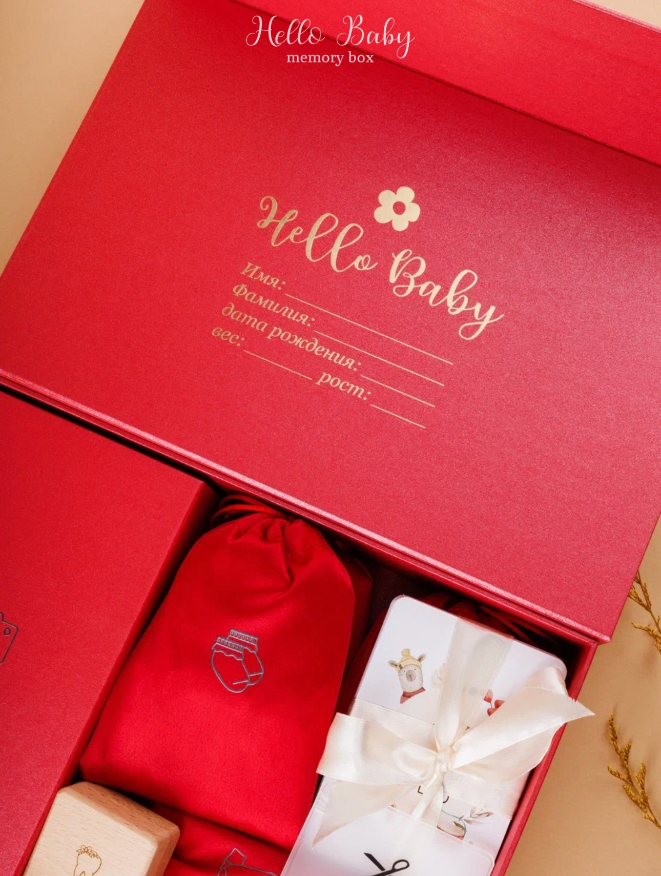 - Коллекционная коробка с золотым тиснением — уникальное место для подписи ФИО, даты рождения, веса и роста вашего малыша.